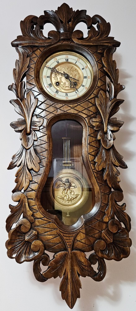 Vand ceas de perete cu pendul, mecanism mecanic Kienzle, seria 530405, fabricat in anii 1910 -1920, cadran emailat cu cifre romane si arabe, mecanism curatat, bate pe un gong spiralat la fix de cat indica ora iar la jumatate o data, mecanism curatat. Functional