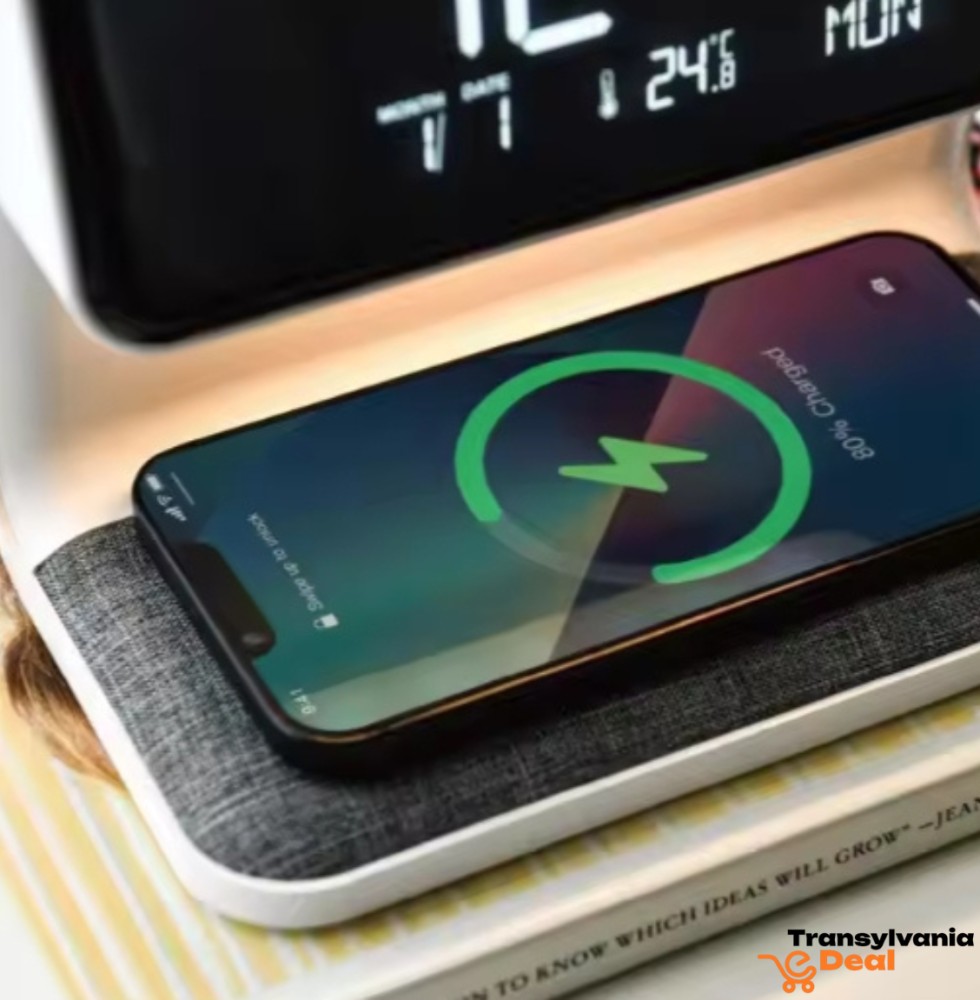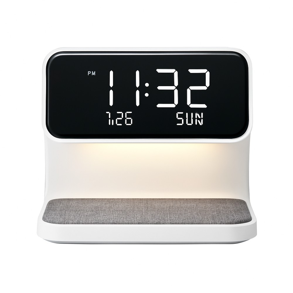 Ceas desteptator digital LED cu incarcare wireless, afisaj temperatura, iluminare ambientala si functie snooze – Design modern pentru birou sau dormit