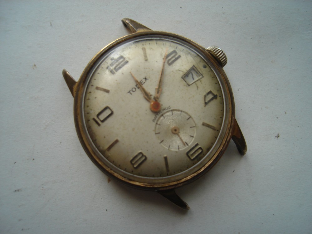 Ceas mecanic Todex Antichoc, cu secudar periferic si data, functioneaza, are autonomie destul de mare. Carcasa are in buna parte aurirea stearsa si capacul protector o serie de mici zgarieturi. 34 mm diametrul.