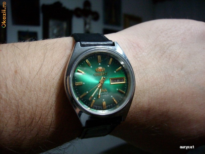 Vand ceas original automatic ORIENT, stare excelenta cu seria de pe capac HL L469711 mecanism automatic 21 rubine, carcasa din otel inoxidabil, functii data, zi, limbile pentru orar si minutar sunt fosforescente, repere aurii puncte luminite. Ceasul este clasic si foarte elegant, rezistent la apa. Ecranul ceasului este de culoare verde sidefat, mecanismul automatic functioneaza extrem de precis iar cureaua este din piele neagra (bratara metalica a trebuit sa fie schimbata).