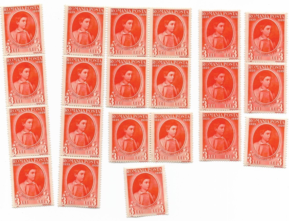 Centenarul nasterii regelui Carol I, 1938, valoarea de 3 L, 21 buc., in blocuri, neobliterate.