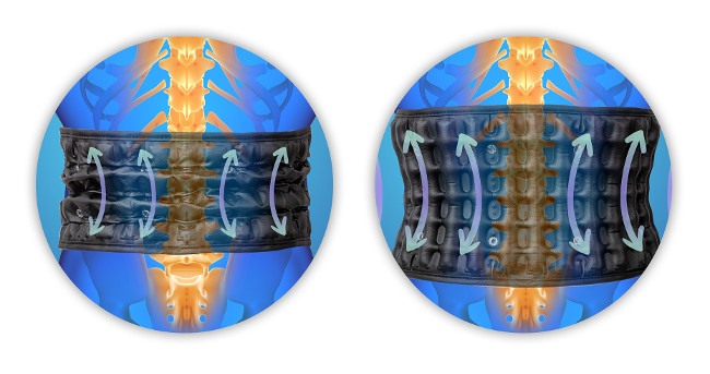 In timpul umflarii, centura se extinde de jos in sus, eliberand presiunea din coloana vertebrala si discuri. Ca urmare, vertebrele pot reveni la pozitia initiala in timp.