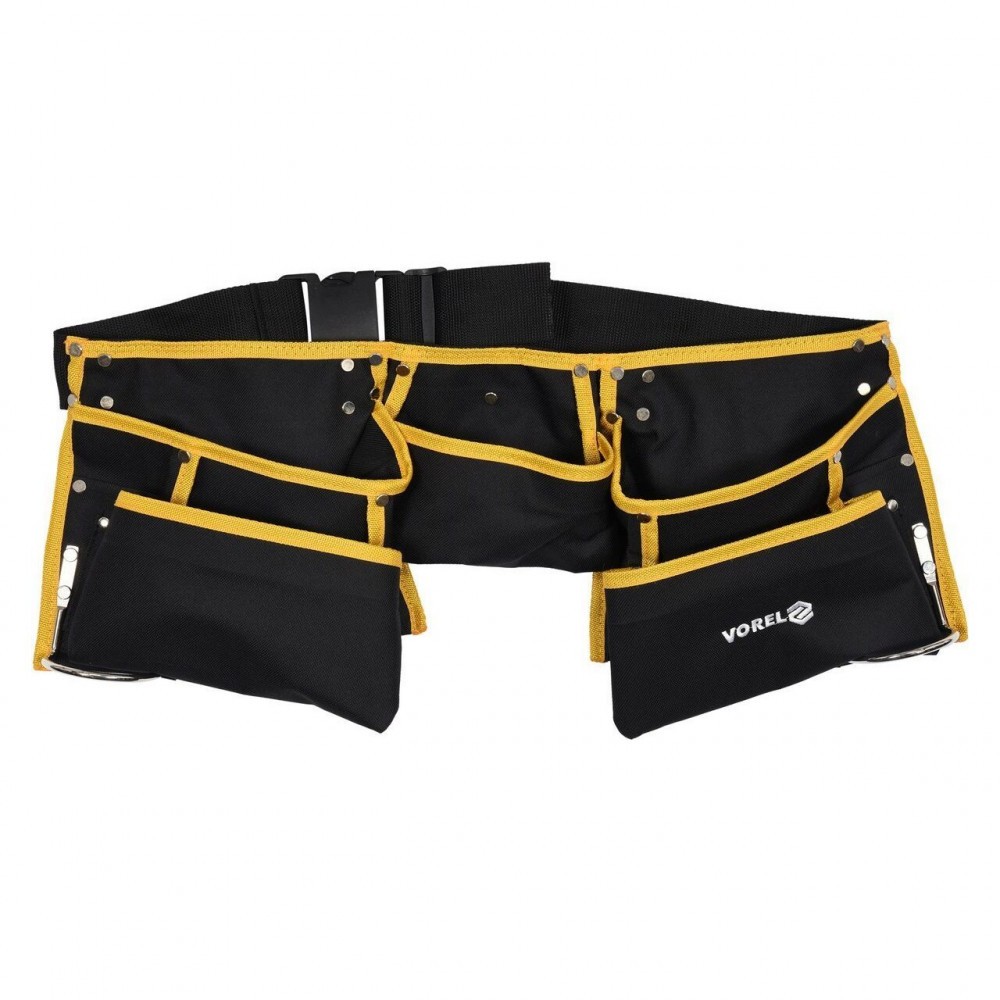 Curea pentru scule de tâmplărie cu unsprezece buzunare cu două suporturi de ciocan metalic. Cusături armate cu nituri metalice. Buzunare atașate permanent de centură. Curea de umăr reglabilă, realizată din poliester 600D, fixată cu o cataramă.