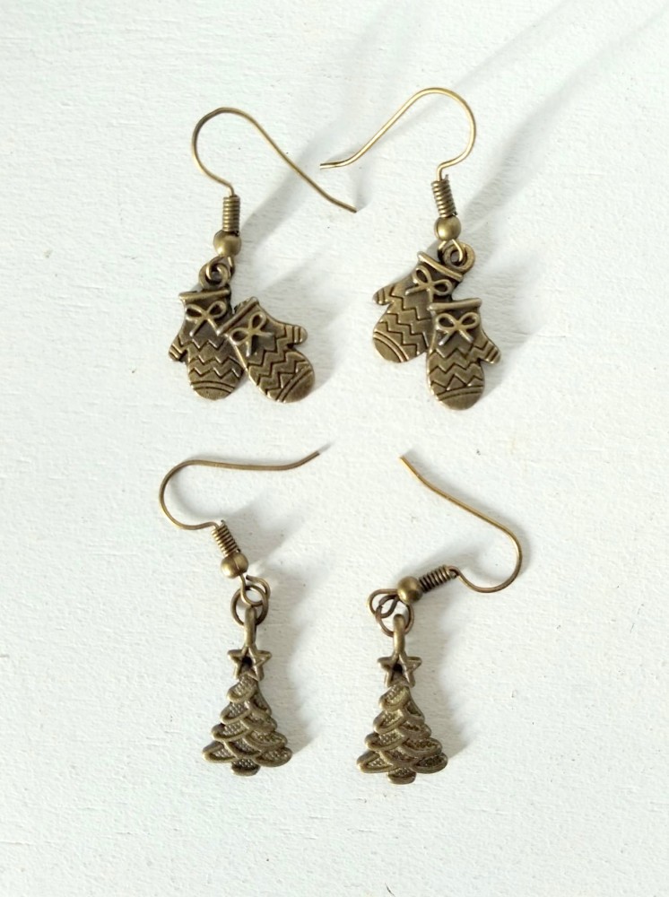 * Cercei bronz, tema: iarna, sarbatori, Craciun - 2 perechi: brad si manusi