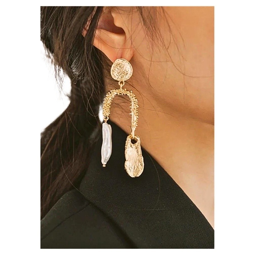 Cercei cu perle Cleopatra - sunt alegerea ideala pentru un look sofisticat si modern. Cu un design aparte, acesti cercei impresioneaza prin forma arcuita si textura neregulata aurie, completata de doua elemente distinctive – o perla de sinteza si un detaliu auriu sculptat.