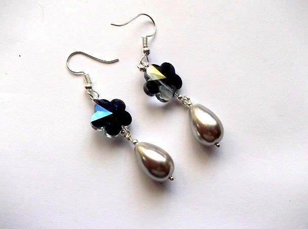cercei cu perle de Mallorca gri deschis si cristale albastre
