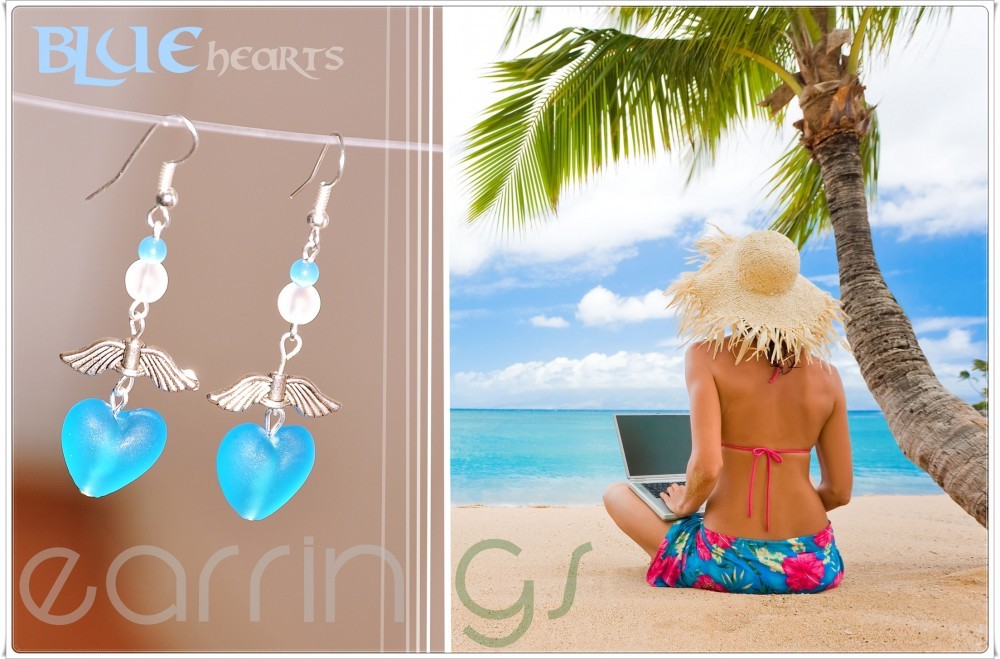 Materiale: tortite argintii cu arc si bila, link-uri argintiu antichizat aripi, margele de sticla lampwork inima frosted 13X15mm - albastru deschis
