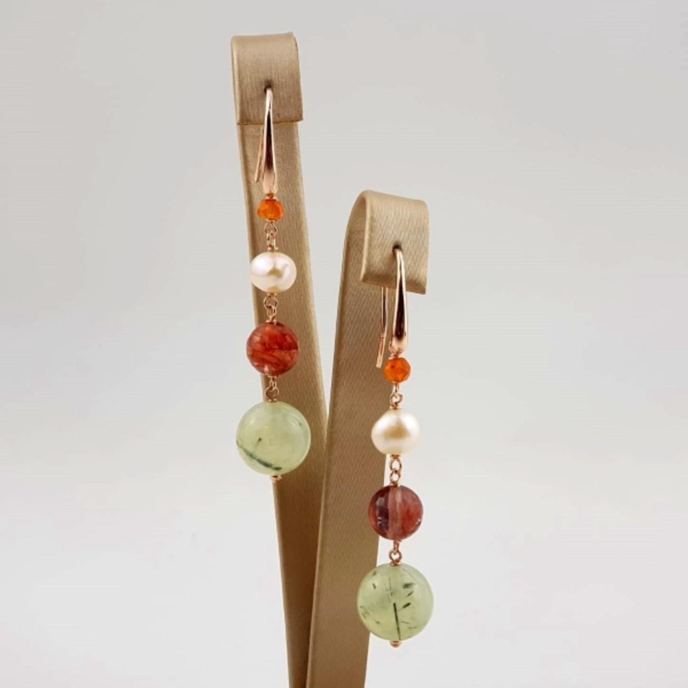 Cercei Mora din cuarț și perle. Cercei cu sfere de 5, 8, 10 și 12 mm din cuarț rutilat verde, cuarț roz si perle de cultură. Lungime: 5,5 cm, fără sistem de închidere. Detalii produs: Argint 925/°°° placat cu aur roz, cu tratament antioxidant unic. Certificat de garanție a materialului. Săculeț de catifea inclus. Fiecare bijuterie este realizată manual cu precizia inconfundabilă Made in Italy. Notă: Pot exista mici diferențe față de imaginea produsului, deoarece fiecare bijuterie este realizată manual, iar perlele sunt neuniforme. Culorile pietrelor semiprețioase pot diferi în funcție de reflexia luminii.