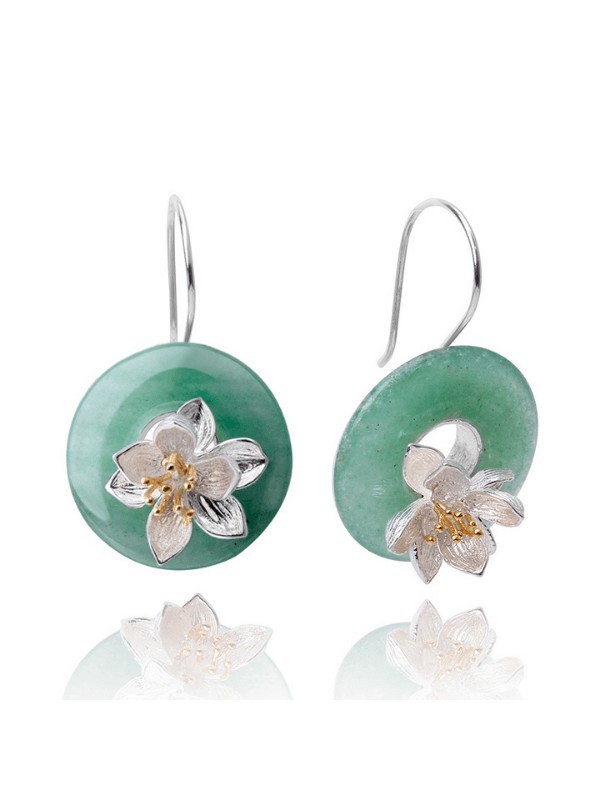 Cercei noi, argint 925 placati cu aur , floare de lotus, tortite , piatra naturala verde aventurin 3 cm lungime 2 cm latime 8.5 grame
