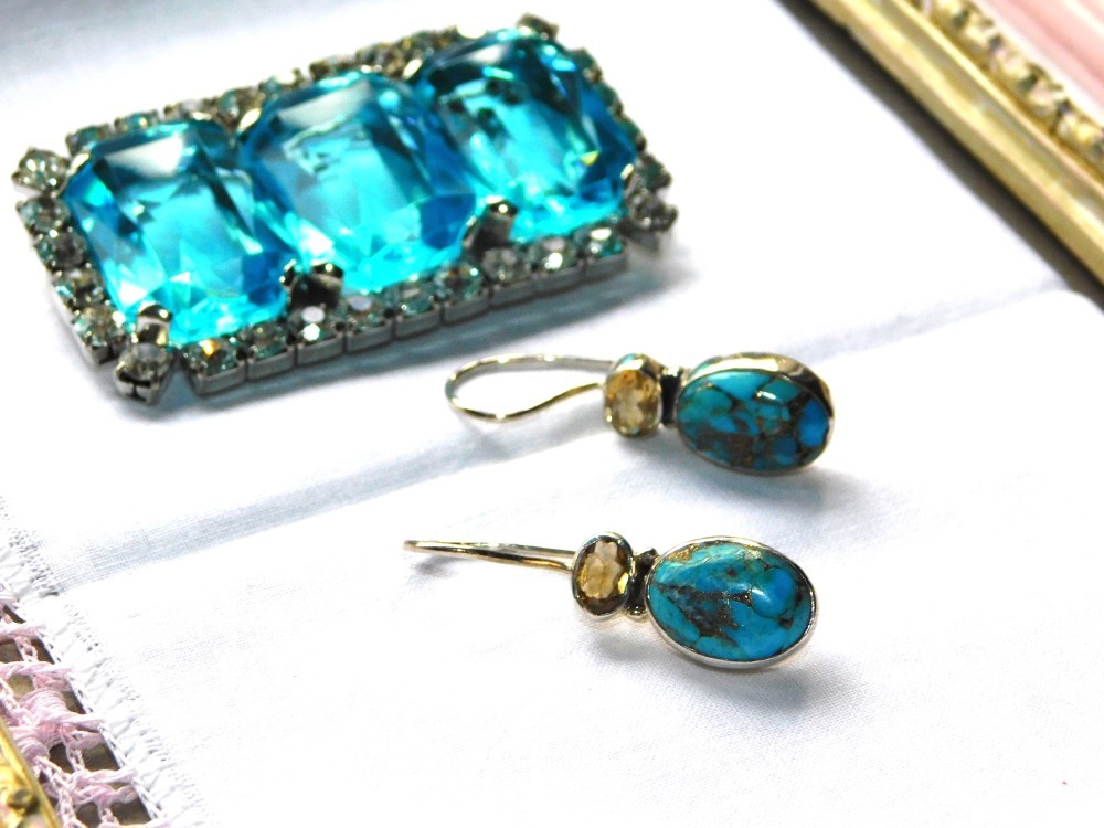 Cercei noi argint turcoaze marmorate cu citrin , brosa noua
