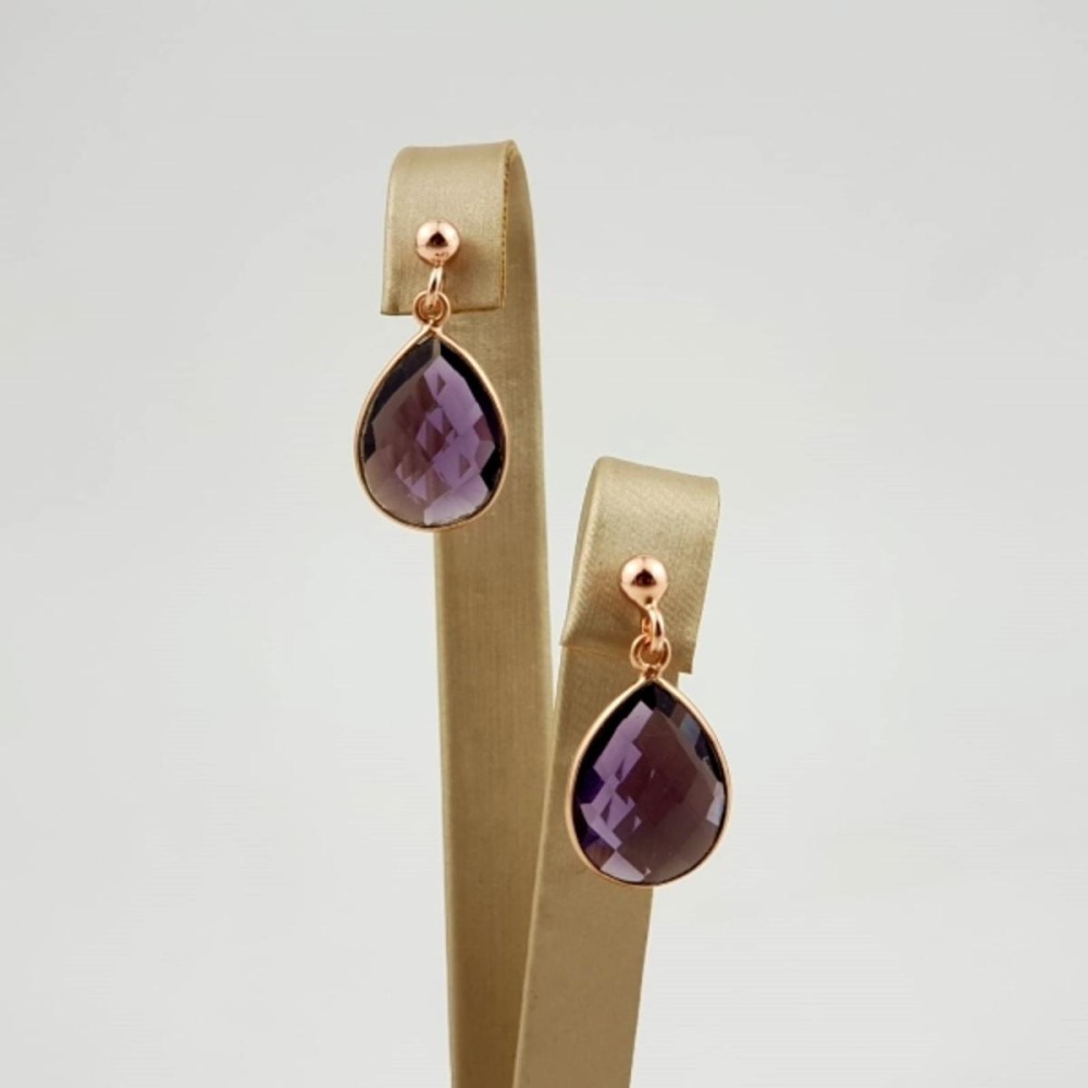Cercei Roua din ametist hidrotermal, fațetat, în formă de lacrimă, cu montură de 18 per 13 mm. Lungime: aproximativ 2.6 cm, închidere cu ac. Detalii produs: Argint 925/°°° placat cu aur roz, cu tratament antioxidant unic. Certificat de garanție a materialului. Săculeț de catifea inclus. Fiecare bijuterie este realizată manual, cu precizia inconfundabilă Made in Italy. Notă: Culorile pietrelor semiprețioase pot diferi în funcție de reflexia luminii.
