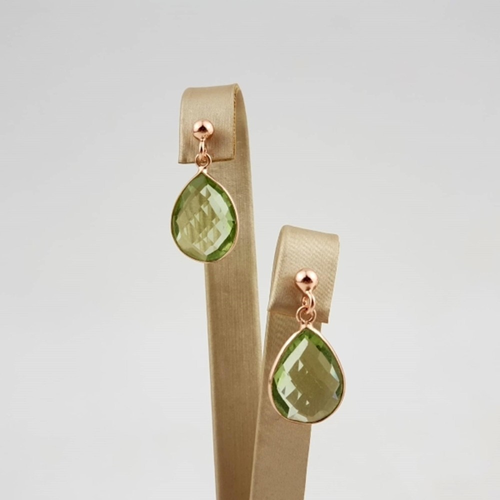 Cercei Roua din ametist verde hidrotermal fațetat, în formă de lacrimă, cu montură de 18 per 13 mm. Lungime: aproximativ 2.6 cm, închidere cu ac. Detalii produs: Argint 925/°°° placat cu aur roz, cu tratament antioxidant unic. Certificat de garanție a materialului. Săculeț de catifea inclus. Fiecare bijuterie este realizată manual, cu precizia inconfundabilă Made in Italy. Notă: Culorile pietrelor semiprețioase pot diferi în funcție de reflexia luminii.