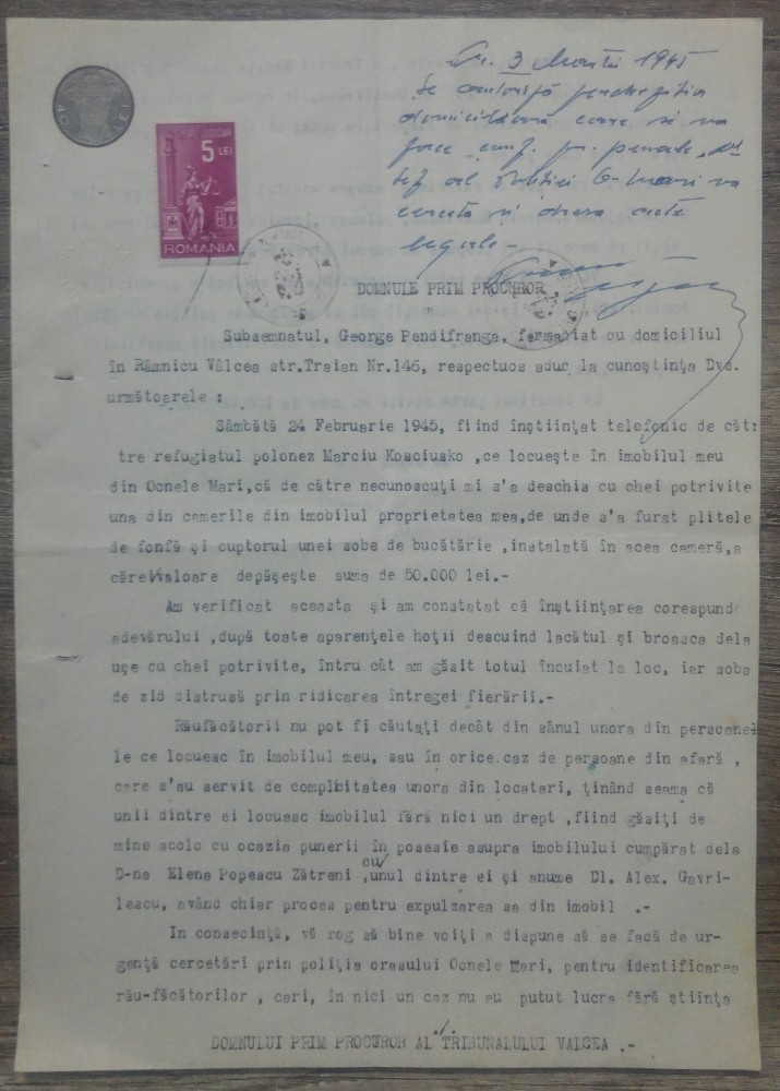 Cere catre Procurorul Tribunalului Valcea privind furt si incepere ancheta/ 1945
