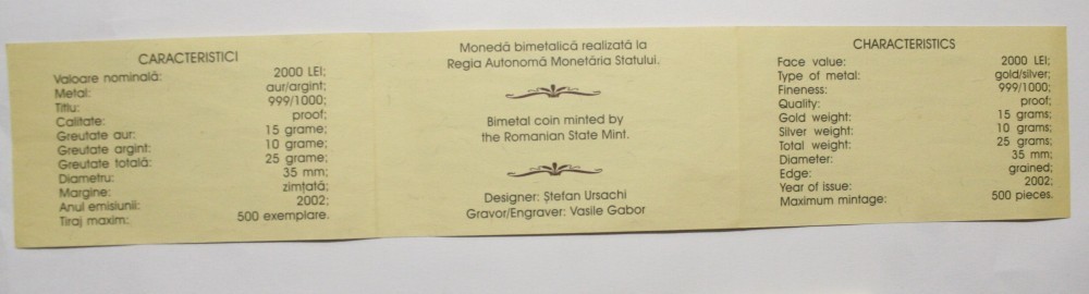 CERTIFICAT PT. MONEDA BNR DE AUR . 2000 LEI 2002