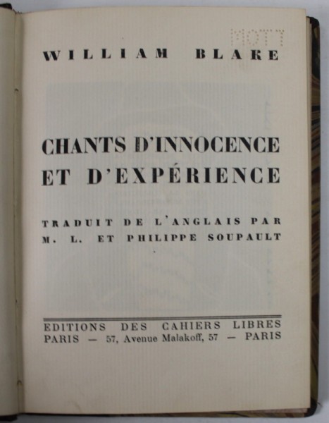 CHANTS D' INNOCENCE ET D 'EXPERIENCE par WILLIAM BLAKE, EXEMPLAR 314, O GRAVURA A AUTORULUI, 1927