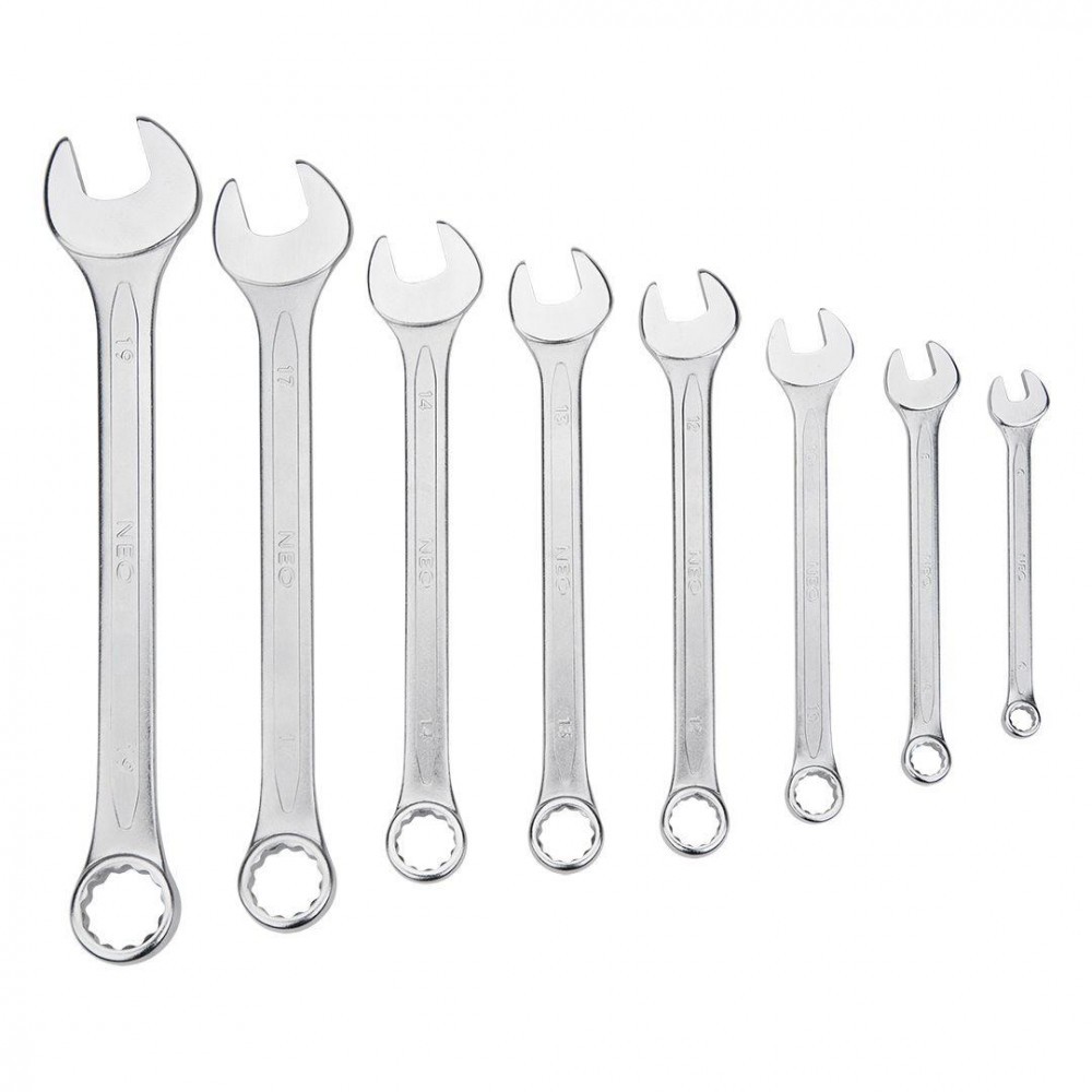 Set chei combinate 6-17 mm Neo 09-751. Set de 8 piese/set, chei fixe - inelare, dimensiuni: 6, 8, 10, 12, 13, 14, 17, 19 mm, cap lustruit si inclinat la un unghi de 15°