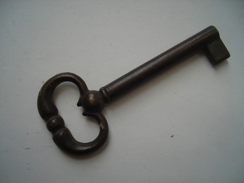 Cheie de mobila, model antichizat, 8 cm lungime, stare buna. Alama sau zamac patinat ca alama.