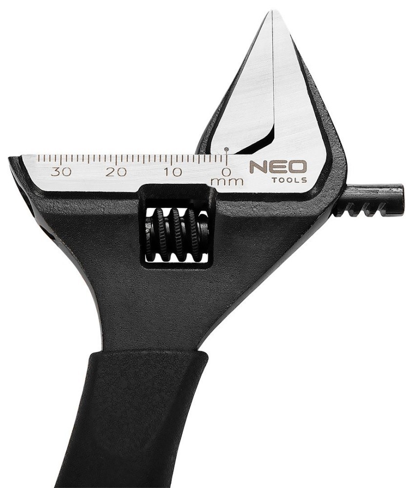 Cheie reglabila 8inchi, Neo Tools. Otel CrV forjat, cap solid, subtire, scara metrica cu interval de 40% mai mare decat o cheie standard, Inclinarea capului de 22° la capatul flexibil, Maner ergonomic acoperit cu material anti-alunecare, Rezistent la lubrifianti si uleiuri