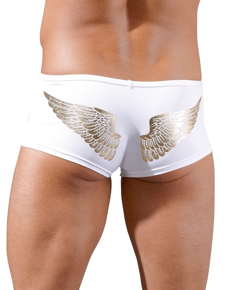 Fii diferit si impresioneaza-ti partenera! Poarta la intalnirile tale intime acesti chiloti, boxeri barbatesti de culoare alba care se muleaza perfect (microfibra) cu fermoar in fata si imaginea printata a unor aripi de inger la spate.. pe fese. Alb/auriu, material 92% polyester, 8% elastane. Import Germania. Skin-tight pants made out of high quality microfibre with a zip on the pouch and angel wings printed on the buttocks. White/gold.
