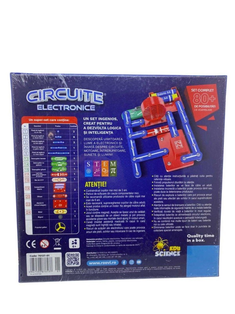 Copilul tău este pasionat de lumea electronicii și ai vrea să învețe mai mult prin experimente distractive? Alege pentru el Circuite electronice, un set ingenios care face știința mai ușor de înțeles pentru copii. Electronica este un domeniu fascinant, dar greu accesibil copiilor. Jocul Circuite electronice este conceput special pentru ca informațiile dificile să fie rapid înțelese de micii ingineri în devenire. Copiii pot astfel să învețe despre circuite electronice, motoare, întrerupătoare, sunete și lumini experimentând prin joc. În plus, își dezvoltă logica și inteligența și pot avea chiar rezultate mai bune la școală. Circuite electronice: 80 de posibilități de asamblare și distracție nelimitată Setul Circuite electronice este ca un puzzle dificil la prima vedere, dar care devine accesibil pe măsură ce începi să pui piesele în ordinea potrivită. În cutie găsești o mulțime de elemente colorate și interesante, cu care poți realiza 80 experimente electronice uimitoare. Astfel poți asambla și experimenta: Un circuit cu bec alimentat prin contact magnetic. Un motor cu elice zburătoare. Un circuit cu un LED și un bec, conectate în paralel. Un circuit cu 2 întrerupătoare conectate în serie. Sunetul de intensitate slabă al sirenei de poliție. Sunetul de intensitate slabă al sirenei de pompieri. Ia-ți așadar rolul de inginer în serios, experimentează și învață rapid informații inedite despre circuitele electronice și rolul lor în viața de zi cu zi. Circuite electronice – un set grozav, creat conform principiilor STEM Setul Circuite electronice face parte din seria EduScience de la ROOVI și este conceput potrivit principiilor STEM în care jocurile pun accentul pe învățare alături de distracție și îi ajută pe copii să se împrietenească de la vârste fragede cu știința. Circuite electronice întrunește cele mai înalte standarde de calitate și siguranță, precum și toate caracteristicile fascinantelor jocuri STEM: Stimulează și susține dezvoltarea gândirii logice și strategice. Dezvoltă imaginația și gândirea creativă. Îmbunătățește capacitatea de concentrare, precum și coordonarea Stimulează comunicarea, dezvoltarea abilităților sociale și lucrul în echipă. Îi ajută pe copii să se familiarizeze cu concepte și noțiuni noi, favorizând totodată dezvoltarea vocabularului. În plus, este foarte distractiv și poate fi prilejul perfect de a te conecta cu copilul tău și de a vă distra de minune împreună. Circuite electronice este un joc educativ super interesant, pentru copii isteți, care explorează și descoperă lumea prin joacă. Jocul Circuite electronice are o grafică de excepție, concepută cu atenție maximă la fiecare detaliu și poate fi un dar perfect de pus sub bradul de Crăciun sau pentru alte ocazii de sărbătoare. Vârsta recomandată: 6+ Joc nerecomandat copiilor mai mici de 3 ani. Conține piese mici care pot fi înghițite.