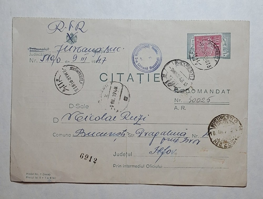 Citație judecătorească poștală 1947 – avocat Nicolae Rezi, București