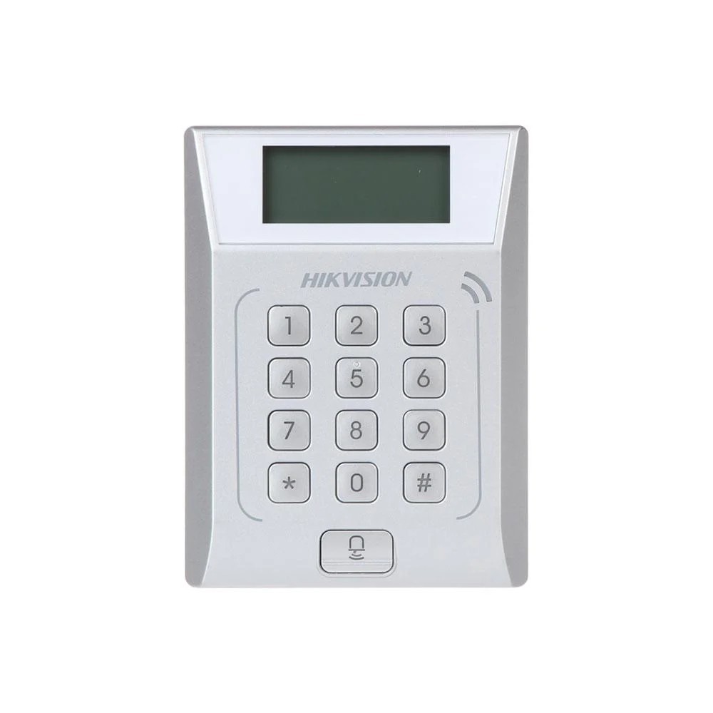 Cititor standalone cu tastatura si card proximitate Hkvision DS-K1T802E, suporta cartele EM 125Khz, capacitate 3000 carduri si 10000 evenimente, autentificare: card, card si parola,display 128x64, Exit Button × 1, Door Sensor × 1, Doorbell × 1, E-lock Output × 1