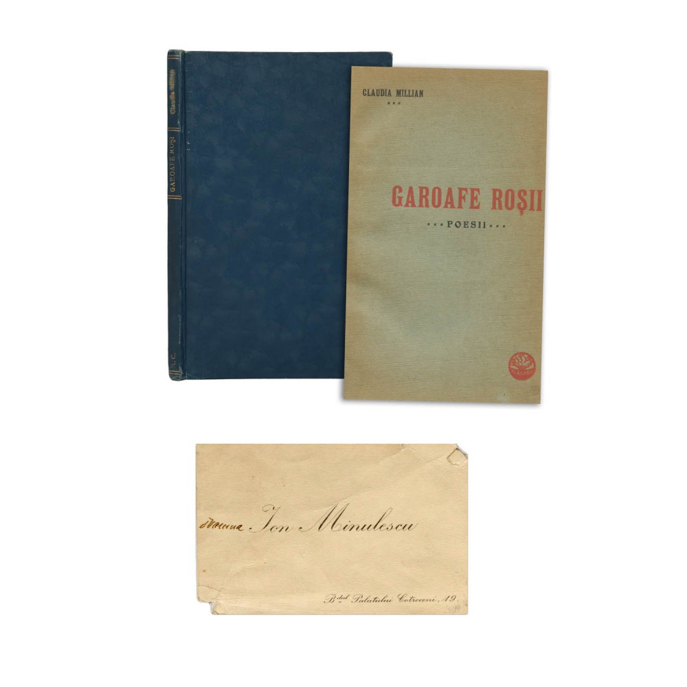 Cartea de vizită ce a aparținut doamnei Ion Minulescu, Claudia Millian. Pe verso regăsim o însemnare olografă a autoarei. Claudia Millian, Garoafe roșii, f.l., Editura Flacăra, f.a., 61 p.