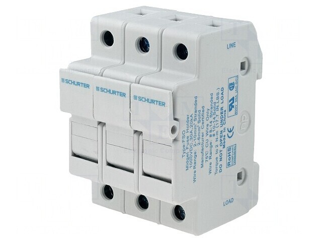 Clemă de siguranțe cilindrice, special concepută pentru montaj pe șină DIN, marca SCHURTER, seria FSO, cod producător 0091.0003. Această clemă asigură o protecție fiabilă și sigură pentru siguranțele cilindrice cu dimensiunea de 10.3x38mm, fiind ideală pentru aplicații ce necesită un curent maxim de 30A și o tensiune nominală de 600V AC.