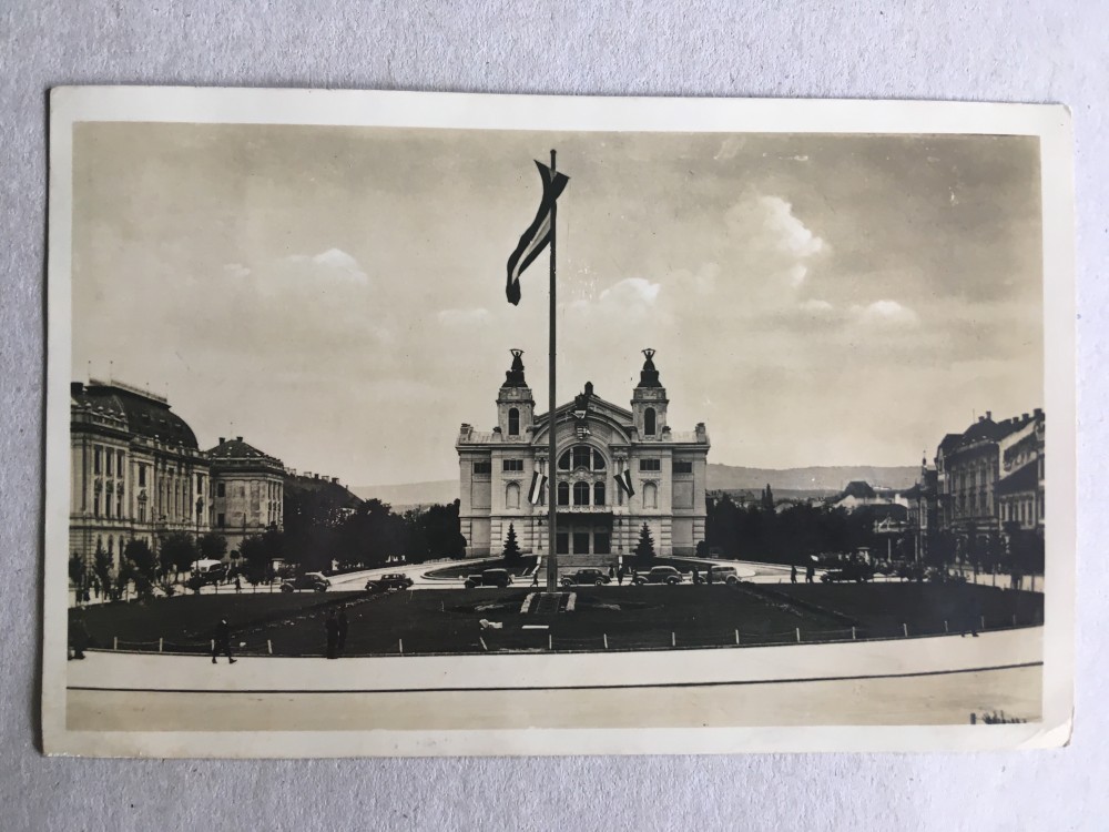 Carte poștală rară, Piața Adolf Hitler din Cluj. Heraldică, steaguri, teatru.