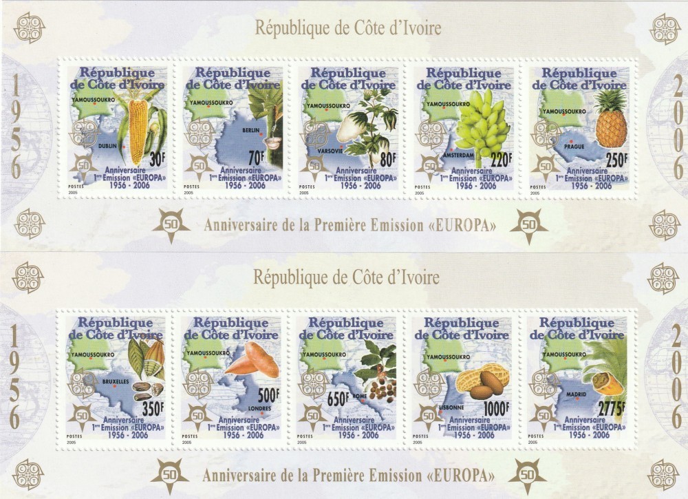 Coasta de Fildes (Cote d'Ivoire} 2005 - 50 ani Europa CEPT, 2 blocuri dantelate,MNH,Mi.Bl.174A- 175A