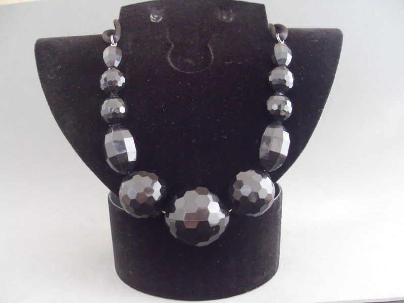 Colier fashion negru, model deosebit creat central din pietre negre lucioase, multifatetate, insiruite crescator spre mijlocul acestuia. Lungime: aprox 55 cm Lungime parte centrala: aprox. 19 cm.Diametru pietre: 0.9-2.4 cm.