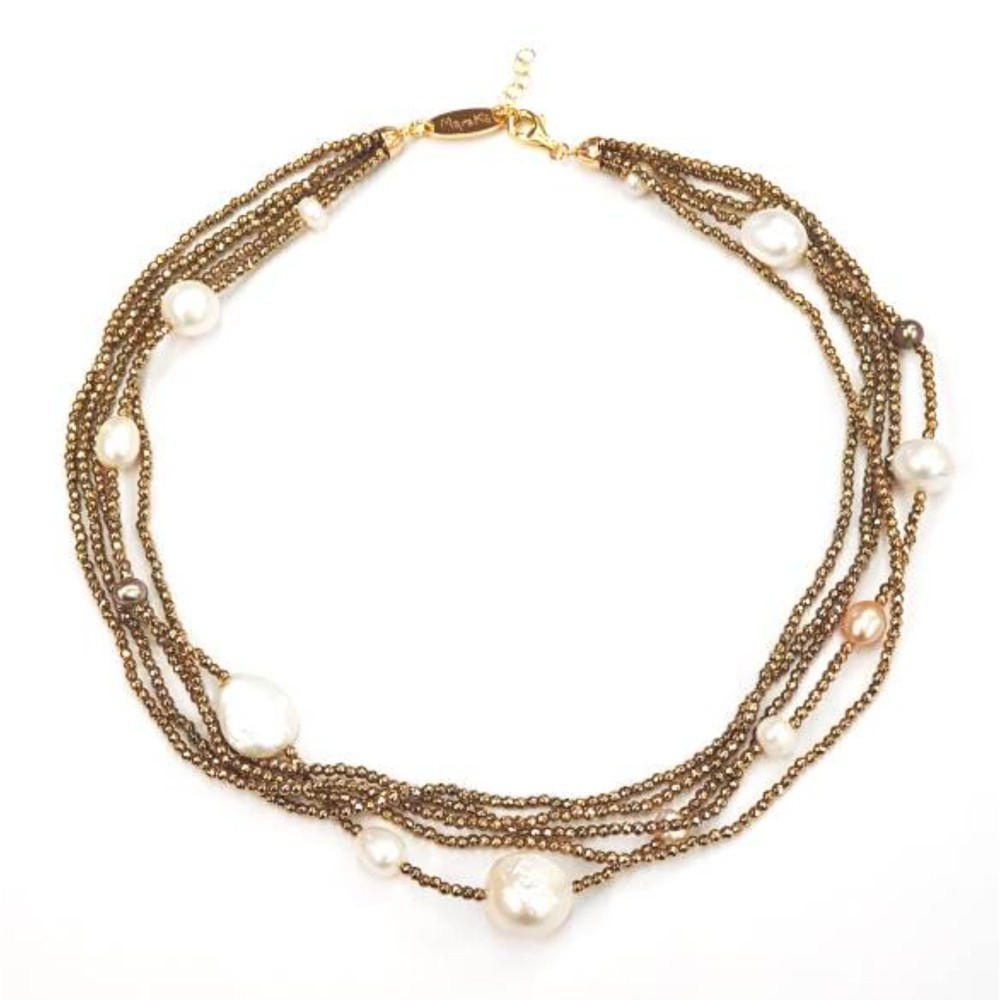 Colier Celeste din hematit auriu și perle. Colier cu cinci șiraguri din hematit auriu natural și perle de cultură. Lungime: 40- 45 cm, reglabil. Se poate compune set cu: Brățară Celeste. Detalii produs: Argint 925/°°° placat cu aur galben, cu tratament antioxidant unic. Certificat de garanție a materialului. Cutie și pungă cadou incluse. Fiecare bijuterie este realizată manual, cu precizia inconfundabilă Made in Italy. Notă: Pot exista mici diferențe față de imaginea produsului, deoarece fiecare bijuterie este realizată manual, iar perlele sunt neuniforme. Culorile pietrelor semiprețioase pot diferi în funcție de reflexia luminii.