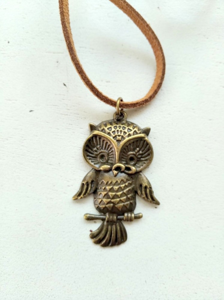 * Colier cu pandativ bufnita (4cm, metal bronz) pe snur de piele maro