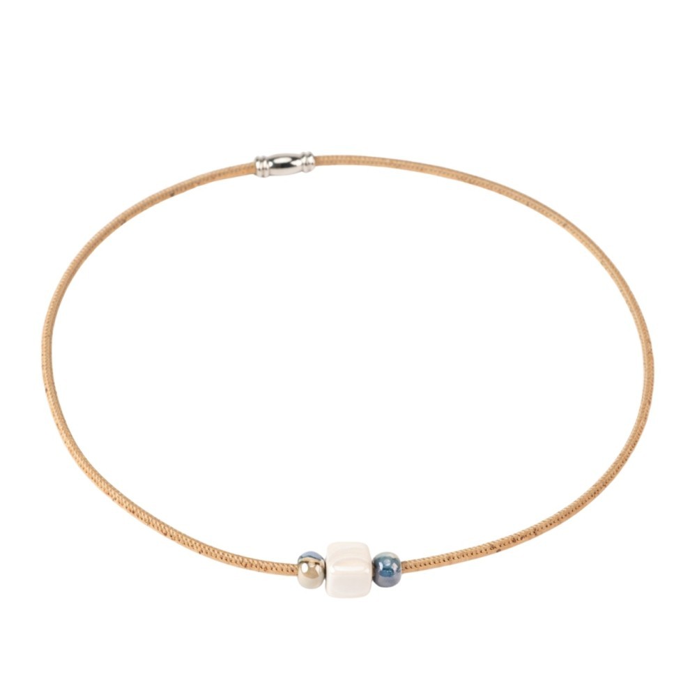 Punctul de atracție al colierului este ceramica albă pătrată, ce aduce un element geometric și modern, creând un contrast puternic cu nuanța caldă a plutei.