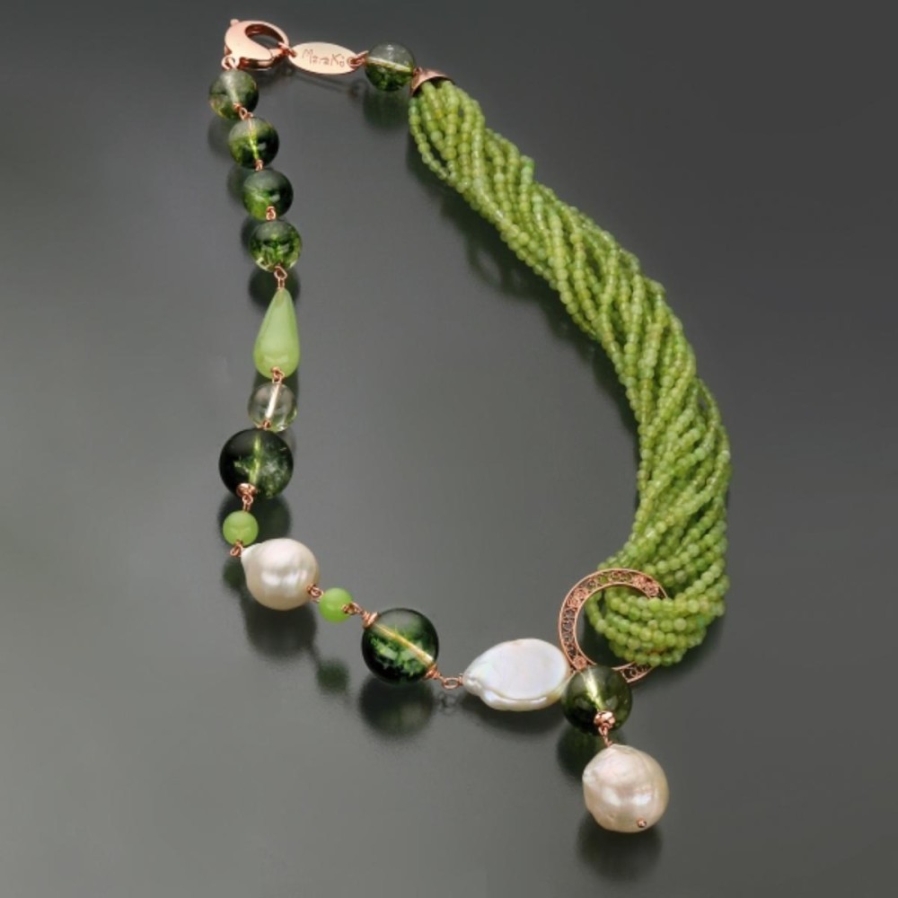 Colier Eclipse din jad, cuarț și perle baroc. Colier (torchon, la baza gâtului) cu multe șiraguri din cuarț verde, jad olive și perle baroc. Lungime: 43 - 48 cm, reglabil. Setul se poate completa cu: cercei Eclipse și brățară Eclipse. Detalii produs: Argint 925/° placat cu aur roz, cu tratament antioxidant unic. Certificat de garanție a materialului. Cutie și pungă cadou incluse. Fiecare bijuterie este realizată manual, cu precizia inconfundabilă Made in Italy. Notă: Pot exista mici diferențe față de imaginea produsului, deoarece fiecare bijuterie este realizată manual, iar perlele sunt neuniforme. Culorile pietrelor semiprețioase pot diferi în funcție de reflexia luminii.