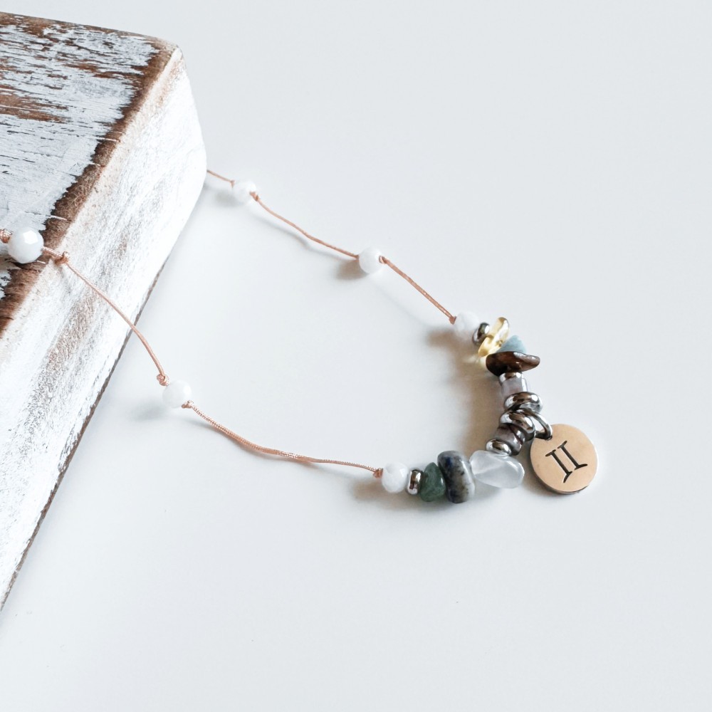 - Realizat cu pietre semipretioase naturale specifice Zodiei Gemeni - piatra lunii, ochi de tigru, aventurin, acvamarin, citrin, lapis lazuli
