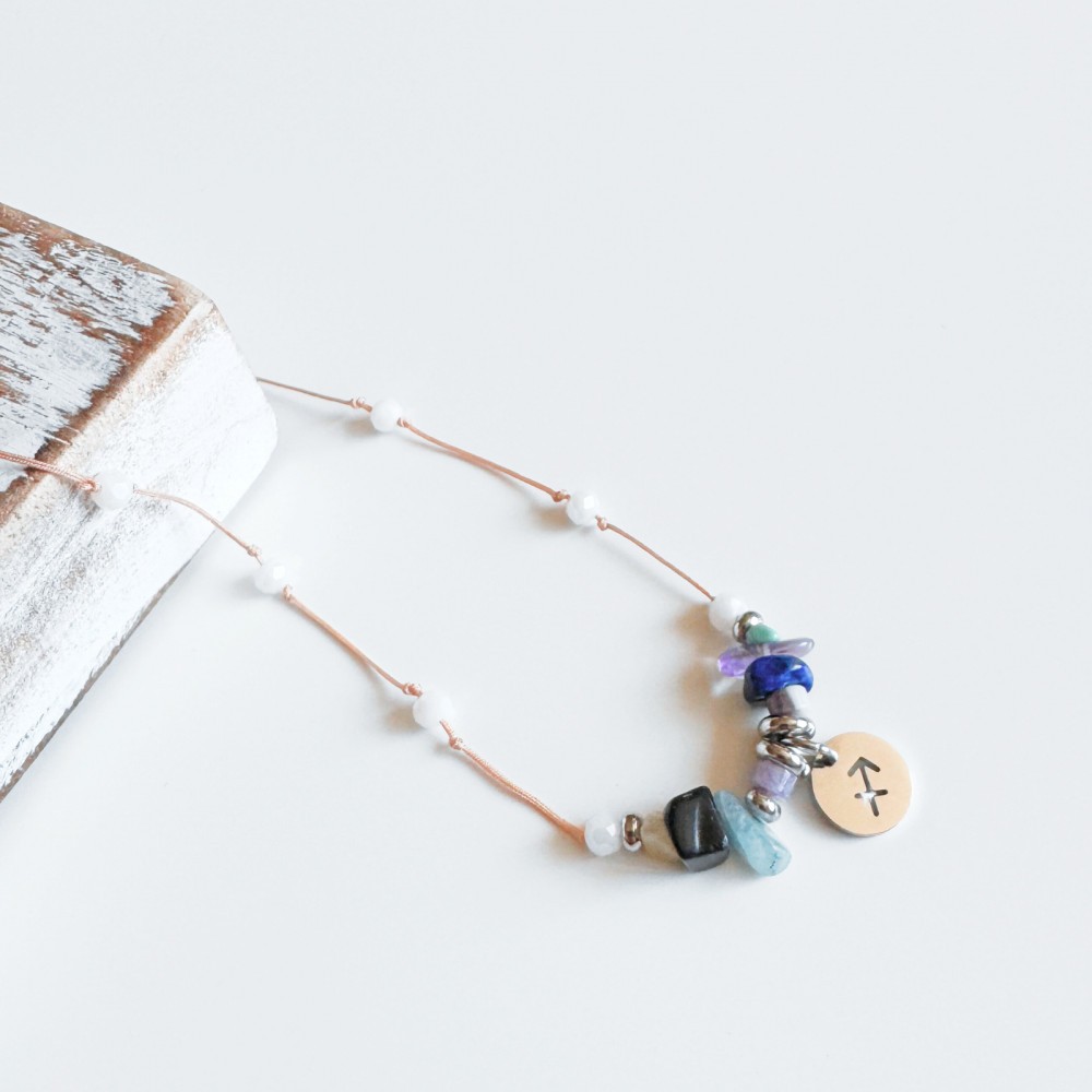 - Realizat cu pietre semipretioase naturale specifice Zodiei Sagetator - piatra soarelui albastra, ametist, acvamarin, turcoaz, citrin, lapis lazuli