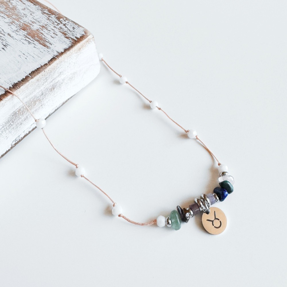 - Realizat cu pietre semipretioase naturale specifice Zodiei Taur - malachit, cuart roz, lapis lazuli, ochi de tigru, ametist, aventurin