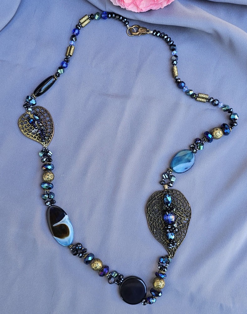 COLIER/ LANT LUNG CU DIFERITE ELEMENTE: STICLA FATETATA, AGATE, METAL