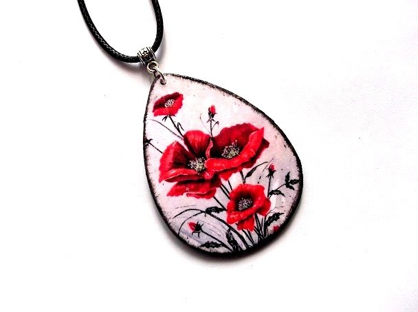 Colier realizat cu tehnica decopaje pe lemn si lacuit cu lac
