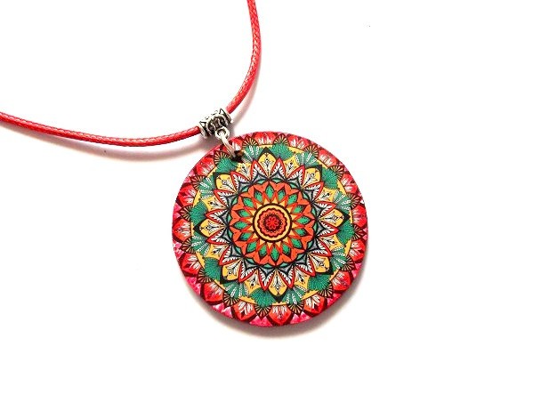 colier realizat cu tehnica decopaje pe lemn si lacuit cu lac