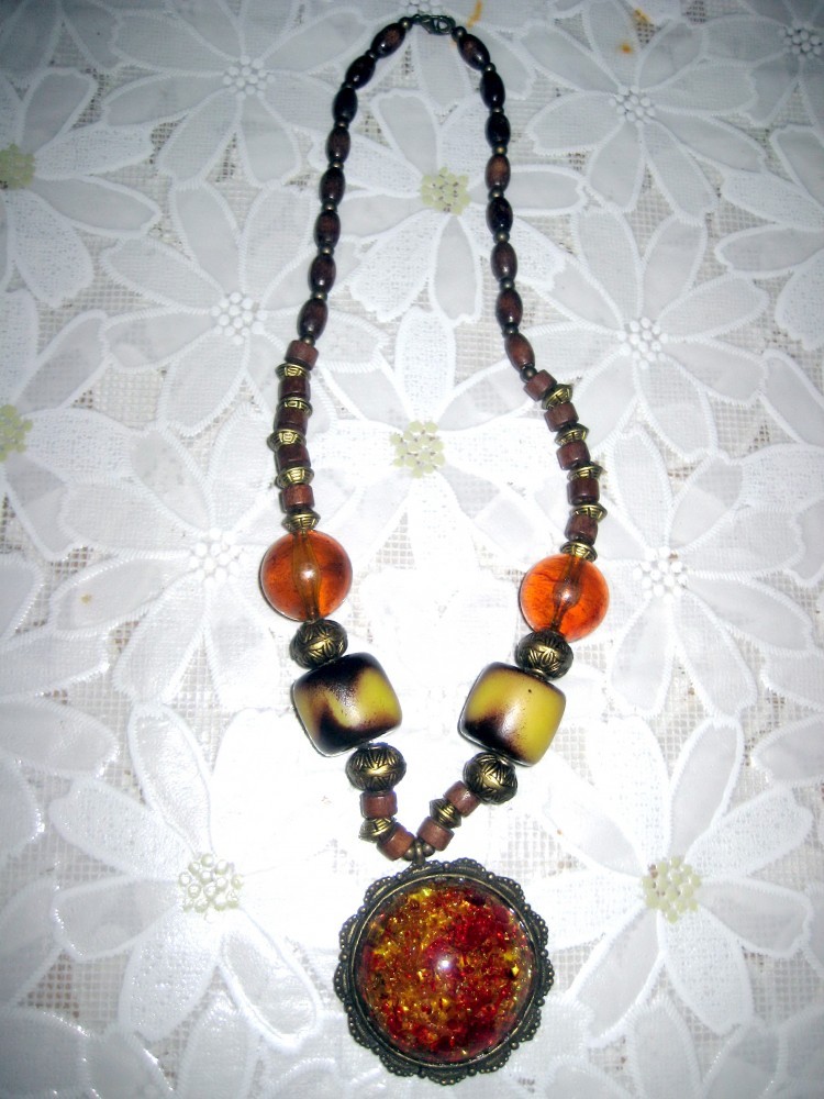 Colier masiv cu pandantiv mare, din bronz, lemn si sticla, cu design frumos si stare buna, colier 34 cm, pandativ 6 cm.
