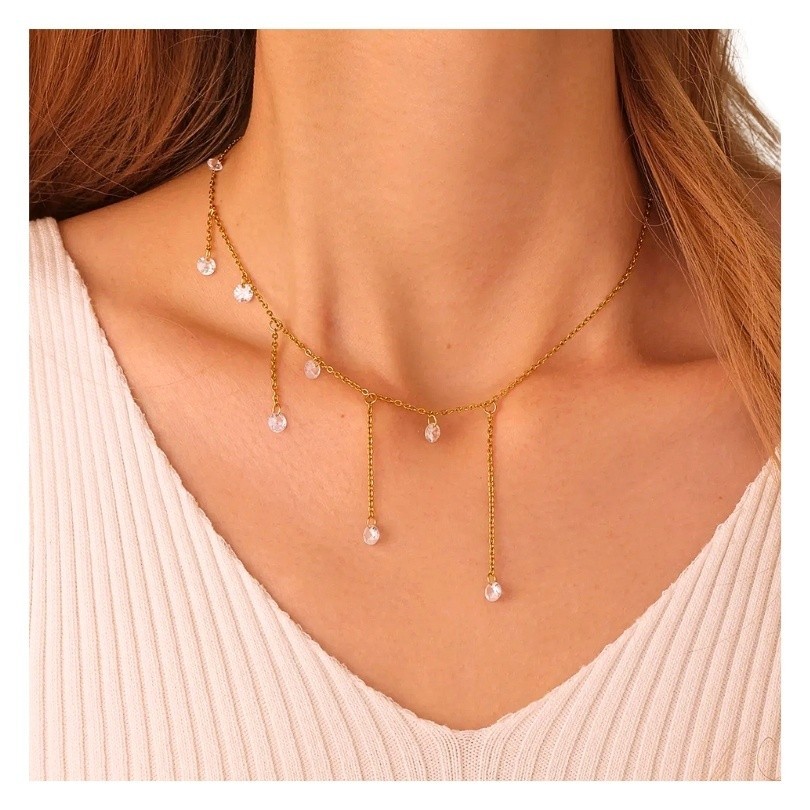 Placat cu aur de 18 carate și pietricele, acest colier este un accesoriu elegant și strălucitor potrivit pentru ocazii speciale sau chiar pentru a adăuga un strop de eleganță în ținutele de zi cu zi.