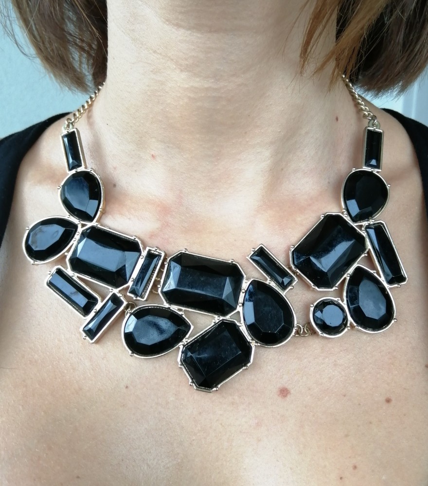 Colier supradimensionat pietre negre sintetice lant auriu rochii corsete sacou