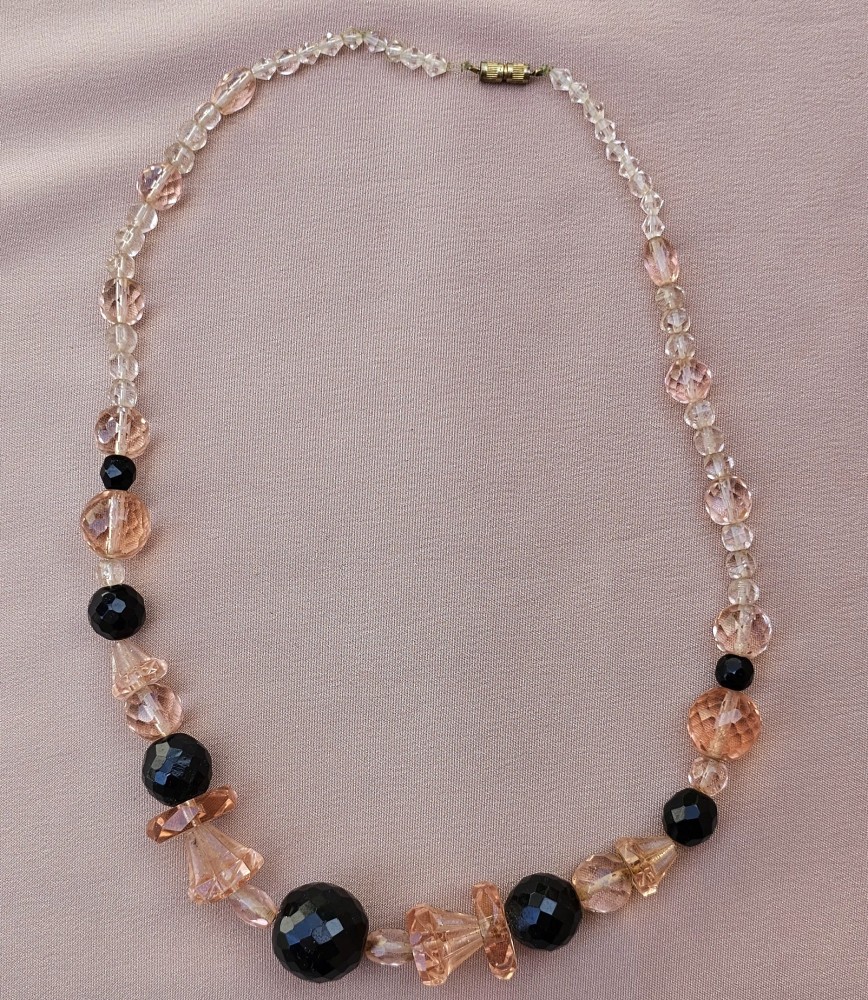 Colier vintage cu mărgele din sticla roz si mărgele din sticla neagra fatetata, dispuse pe un fir de nylon transparent. Mărgelele au forme geometrice variate, sfere și conuri. Colierul se închide cu un sistem metalic de tip șurub. Stare de conservare: buna.