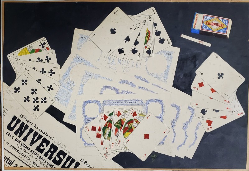 Compozitie cu Ziarul Universul, Bancnote si Carti de Joc