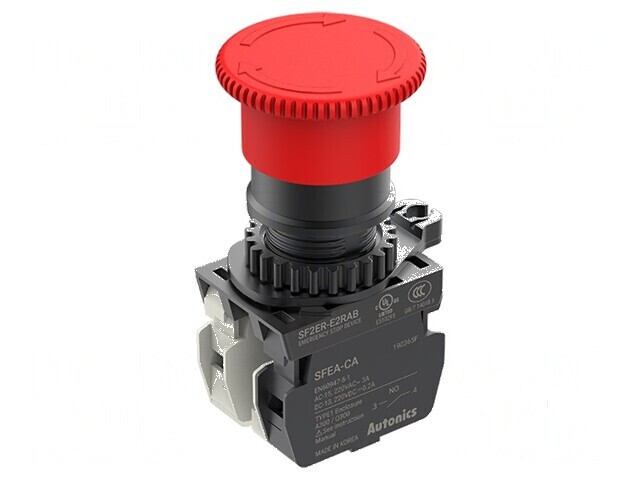 Ø40mm, iar forma butonului de tip cap ciupercă, de culoare roșie,