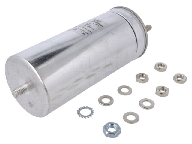 Condensatorul KEMET polipropilenă 500µF 330V M10 șuruburi, seria C44P, oferă performanță superioară și fiabilitate în aplicații ce solicită componente de înaltă calitate. Proiectat pentru a funcționa în intervalul de temperatură -40...80°C, acest condensator dispune de montare prin șurub M12 și terminale cu șuruburi M10, asigurând o fixare solidă și sigură. Rasterul terminalelor este de 35 mm, facilitând integrarea precisă în circuite. Cu o capacitanță de 500µF și o toleranță de ±10%, condensatorul prezintă o rezistență ESR scăzută de doar 1,2 mΩ, ceea ce contribuie la eficiență și stabilitate în funcționare. Curentul de lucru maxim admis este de 63A, iar tensiunea de lucru suportată este de până la 330V AC și 700V DC. Încadrat în categoria climatică 25/70/56 conform standardului IEC 60068-1, acest condensator este proiectat să reziste condițiilor variate de mediu. Dimensiunile corpului sunt Ø85x197 mm, oferind un echilibru optim între performanță și compactitate. Alegerea ideală pentru utilizatori care caută un condensator cu polipropilenă robust, precis și durabil.