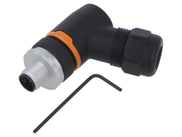 Conectorul M12 5 pini tata unghi 90° IP67 pe cablu, marca LAPP, reprezintă o soluție robustă și fiabilă, adaptată pentru medii exigente. Fabricat din poliamidă rezistentă, corpul conectorului asigură durabilitate și protecție optimă, fiind certificat cu clasa de etanșeitate IP67, garantând protecție împotriva prafului și a infiltrațiilor de apă. Contactele placate cu aur și realizate din aliaj de cupru oferă performanțe electrice superioare, asigurând o conductivitate excelentă și o rezistență crescută la coroziune. Tensiunea nominală este de 63V, iar curentul nominal suportat este de 16A, potrivit pentru o gamă largă de aplicații. Conectorul este prevăzut cu 5 pini, dispuși într-un codaj L - Power, și este orientat în unghi de 90°, facilitând instalarea în spații restrânse. Montarea electrică se realizează prin terminal cu șurub, iar sistemul de fixare utilizează filet exterior pentru o prindere sigură pe cablurile cu diametru exterior între 8 și 12 mm și secțiune între 0,5 și 2,5 mm². Designul tip mufă și subtipul tata asigură conexiuni stabile și durabile, ideale pentru instalare pe cablu, conferind astfel flexibilitate și siguranță în utilizare. Temperatura de operare variază între -25 și 85°C, asigurând funcționarea în condiții variate de mediu.