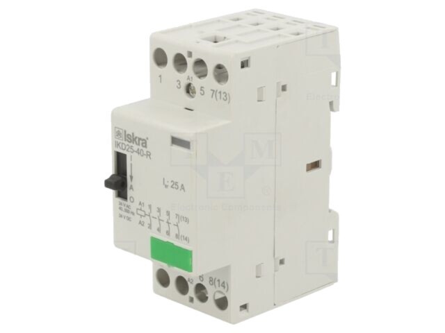 Contactorul ISKRA 4 poli IKD-R este proiectat pentru montare pe șină DIN, asigurând o instalare rapidă și sigură în diverse aplicații electrice. Dispune de terminale cu cleme cu șurub, garantând o conexiune fermă și durabilă. Cu un curent de lucru maxim de 25A, acest contactor oferă performanță și fiabilitate în operare. Configurația pinilor este NO x4, iar aspectul comutatorului include pozițiile ON, AUTOM și OFF, facilitând controlul precis al circuitului. Tensiunea de control este duală, fiind compatibil atât cu 24V AC, cât și cu 24V DC, ceea ce crește versatilitatea dispozitivului. Tipul contactorului este 4-polar, ideal pentru instalații electrice ce necesită comutare pe patru circuite simultan. Fabricat de ISKRA, seria IKD-R, acest contactor combină calitatea superioară cu funcționalitatea avansată, oferind o soluție durabilă și eficientă pentru sistemele electrice moderne.